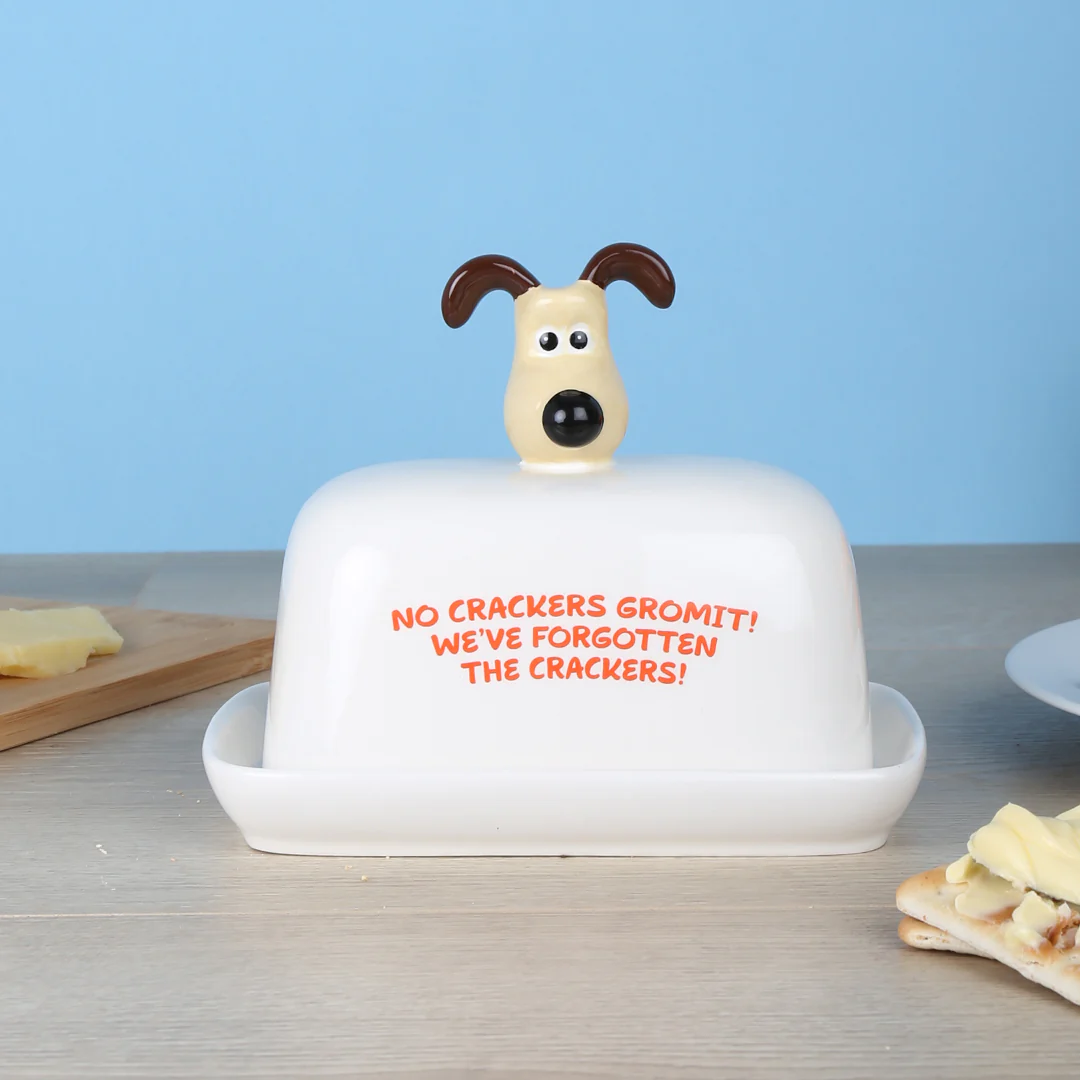 Indulge yourself or your butter half with a Gromit butter dish. It features our favourite Beagle on the top, as the handle with the classic line from Wallace & Gromit's A Grand Day Out 'No crackers Gromit! We've forgotten the crackers.'