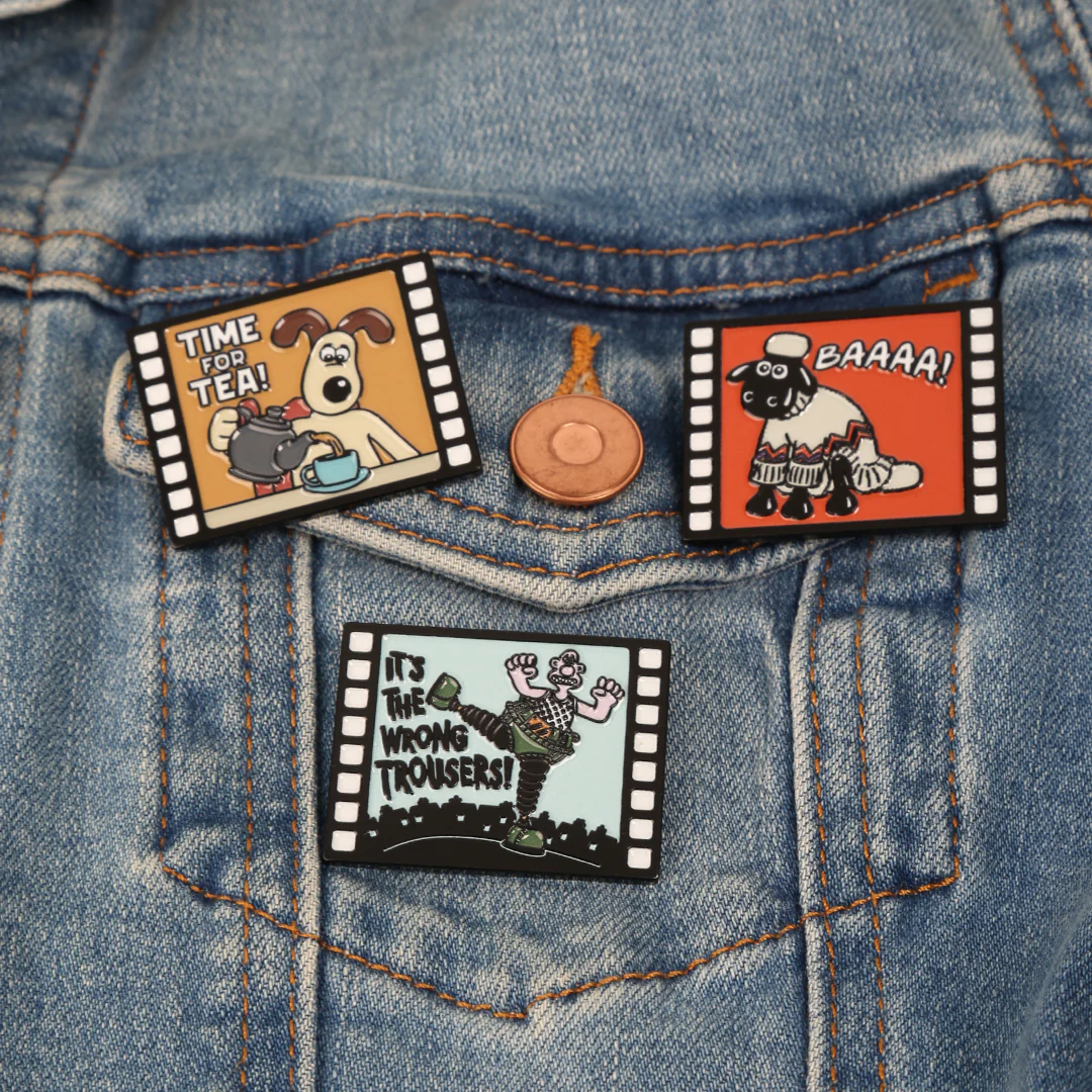 Celebrate the legendary Wallace and Gromit film The Wrong Trousers with this enamel pin badge featuring Wallace in the out-of-control Techno Trousers. Bring this memorable scene to your wardrobe and your everyday life with a movie strip enamel pin badge.